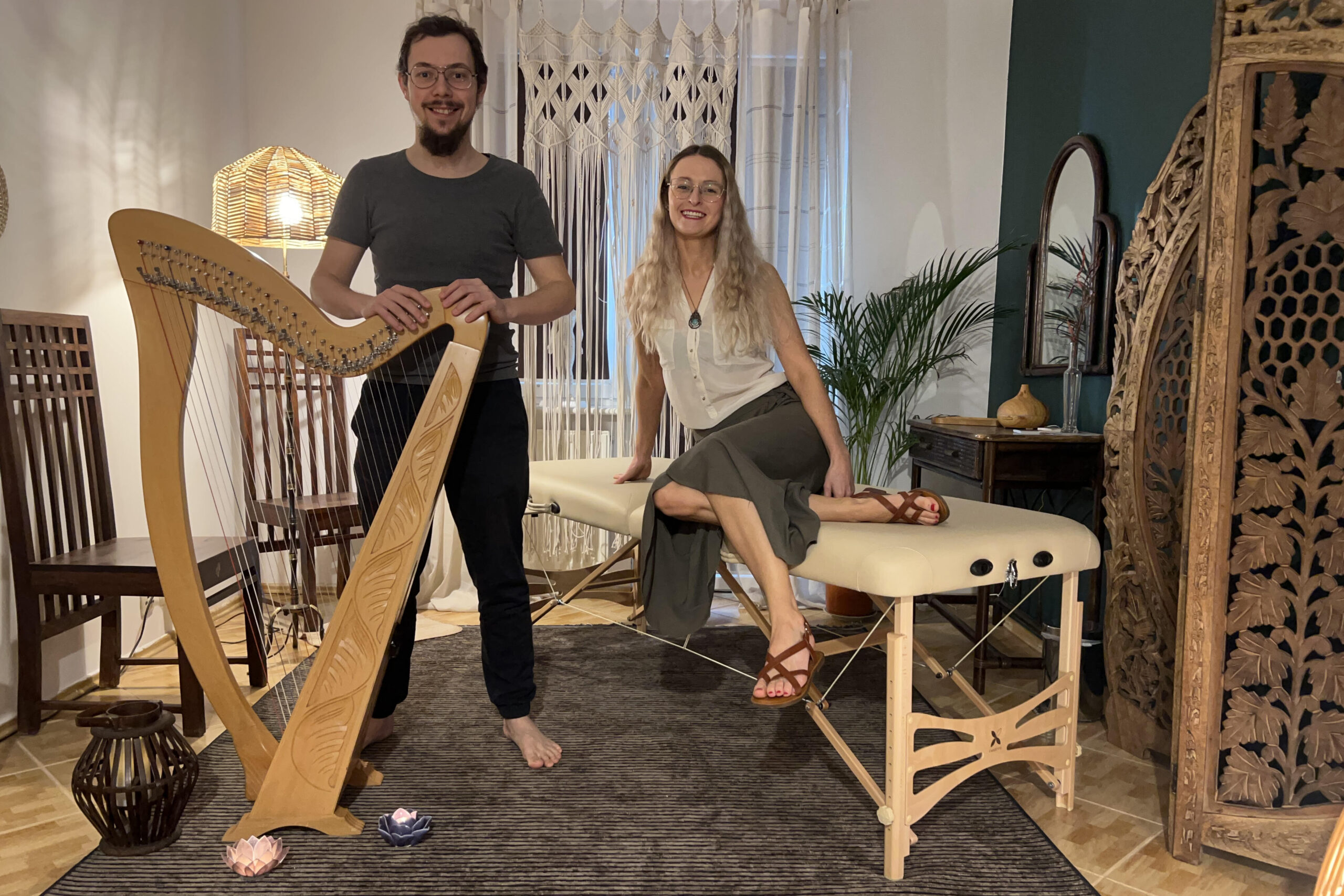 Magiczne sesje wybranego masażu z akompaniamentem muzyki na żywo są absolutnie unikatowym połączeniem sztuki dotyku i muzykoterapii. W podróży będzie towarzyszyć nam multiinstrumentalista Adam, dysponujący szerokim wachlarzem instrumentów od harfy, przez różnej maści flety, strunowce, aż po tajemniczą nyckelharpę. Każda sesja jest w całości improwizowana i dobrana do Twoich preferencji muzycznych i nastroju. Po małej demonstracji barw możesz sam wybrać instrumenty i wskazać nam, na jaką muzykę masz dzisiaj ochotę. 🙂