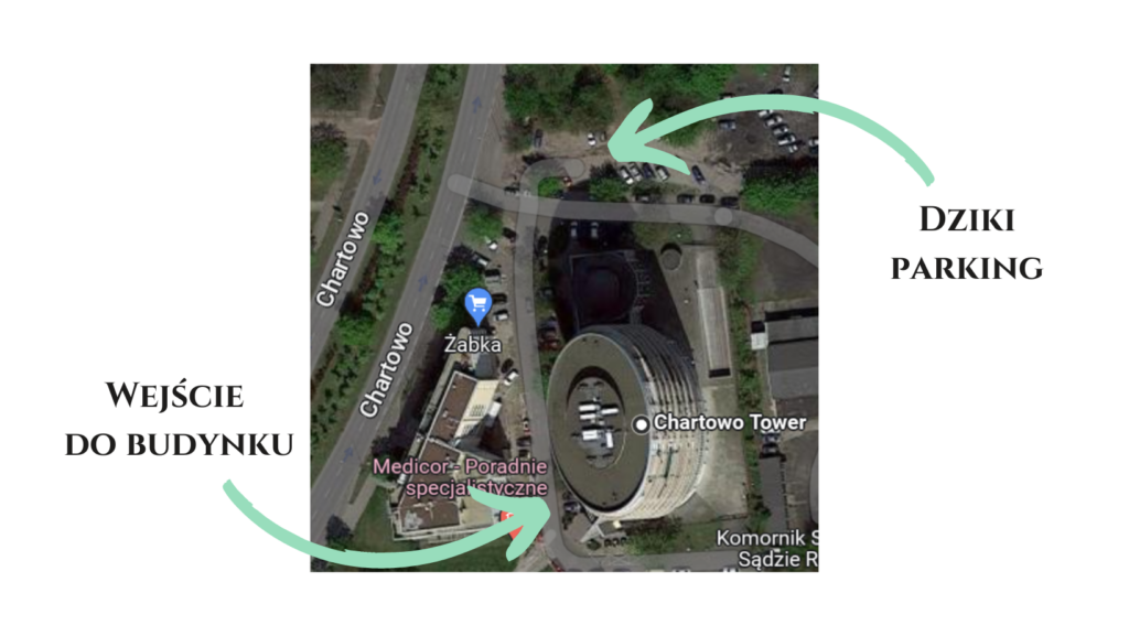 W recepcji budynku znajduje się poczekalnia. Samochody polecam parkować na “dzikim parkingu”, między budynkiem Chartowo Tower a stacją Circle K.